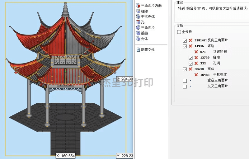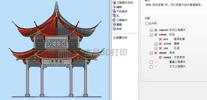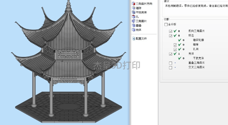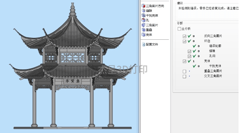 3D打印具有许多优点,例如快速制造高质量的模型,并且不需要传统的制造方法(如开模)。然而,如果3D模型文件存在问题,如坏边、错误轮廓或壁厚问题,将会导致打印失败。为了解决这个问题,我们的公司通过专业的建模软件对亭子手板模型进行修复和调整,以确保模型的完整性和正确性。