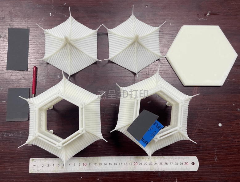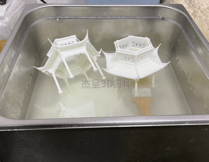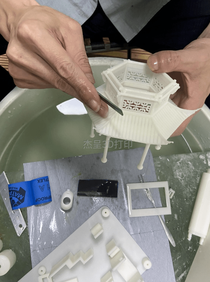 然后,我们使用工业级3D打印机来制作模型。这些打印机能够快速制造出光滑表面且细节精细的模型。与传统的手板加工方法相比,3D打印不仅节省时间,而且效果出色,尤其适用于小批量生产手板模型。然而,通过光固化3D打印出来的凉亭模型并不能直接使用。还需要进行一些后处理工艺来提升表面效果。例如,去除打印过程中产生的支撑结构和层纹线,以获得更加完美的手板模型表面效果。