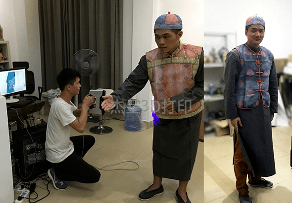 在创作过程中,团队成员穿上戏服,并摆好造型,使用三维扫描仪采集人物的3D数据。余楠老师借助扫描功能快速完成了人物的3D扫描过程,为后续模型修改提供了准确的三维数据。随后,将获取到的3D数据导入三维软件进行修改,创建出书院建筑场景,并将人物与场景进行组合。