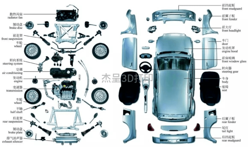汽车设计研发阶段,如果只考虑尺寸和装配验证,几乎所有非精密零部件都可以通过3D打印技术制造,并满足验证要求。然而,如果要实现功能性验证,并最终应用于量产阶段,就需要选择合适的3D打印材料和工艺,并满足零部件的实际工况要求。这需要汽车行业和3D打印技术从业者之间积极探索和沟通,投入时间和精力进行攻关,这也是新技术应用中最具挑战性的部分。在汽车的不同部分中,发动机、底盘、车身和电气设备等构成了整车的主要组成部分。根据材料类型,汽车零部件可以分为金属和非金属两大类。金属零部件主要用于发动机、变速箱、车身、车架、悬挂、底盘和电子设备,而非金属材料则主要用于车辆的内饰、外观、密封件和轮胎等部位。